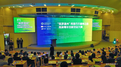 10月25日上午,溫州首屆2019世界青年科學(xué)家峰會,“筑夢溫州”阿里巴巴“諸神之戰(zhàn)”兩岸青年創(chuàng)新創(chuàng)業(yè)大賽在溫州市人民大會堂舉行,兩岸青年攜20個創(chuàng)新創(chuàng)業(yè)項目赴溫參加大賽,活動設(shè)有兩岸青年創(chuàng)新創(chuàng)業(yè)項目路演、產(chǎn)業(yè)對接、兩岸青創(chuàng)論壇等環(huán)節(jié)。