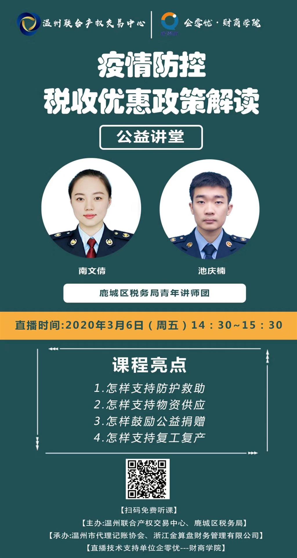 此次公益網(wǎng)絡(luò)大講堂由溫州聯(lián)合產(chǎn)權(quán)交易中心聯(lián)合鹿城區(qū)稅務局、浙江金算盤財務管理有限公司、溫州市記賬代理協(xié)會共同發(fā)起,企零憂·財商學院提供技術(shù)支持和協(xié)助。