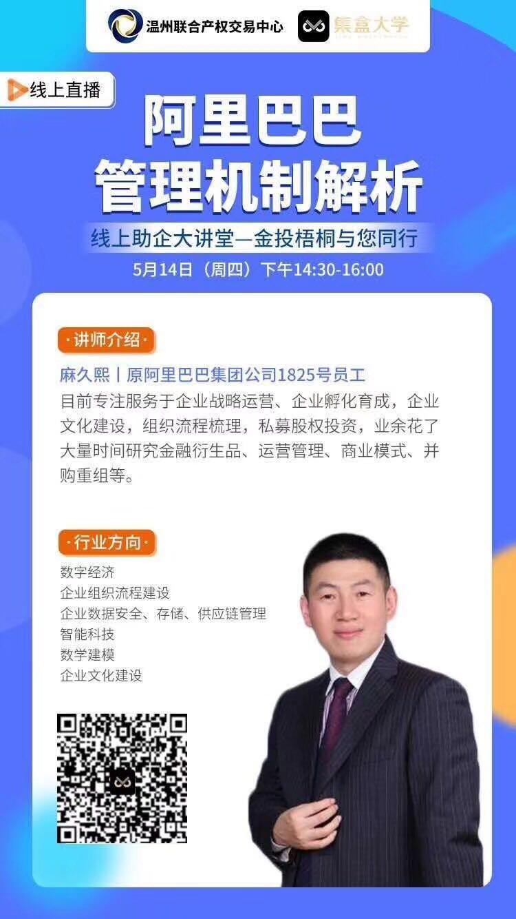 5月14日,溫州聯(lián)合產(chǎn)權(quán)交易中心順利開展了第六期暖企活動。本次活動特邀請一帶一路數(shù)字經(jīng)濟(jì)實(shí)驗(yàn)室主任麻久熙老師,以線上直播的形式,為溫州地區(qū)數(shù)百家企業(yè)進(jìn)行以“阿里巴巴管理機(jī)制解析”為主題的課程分享。