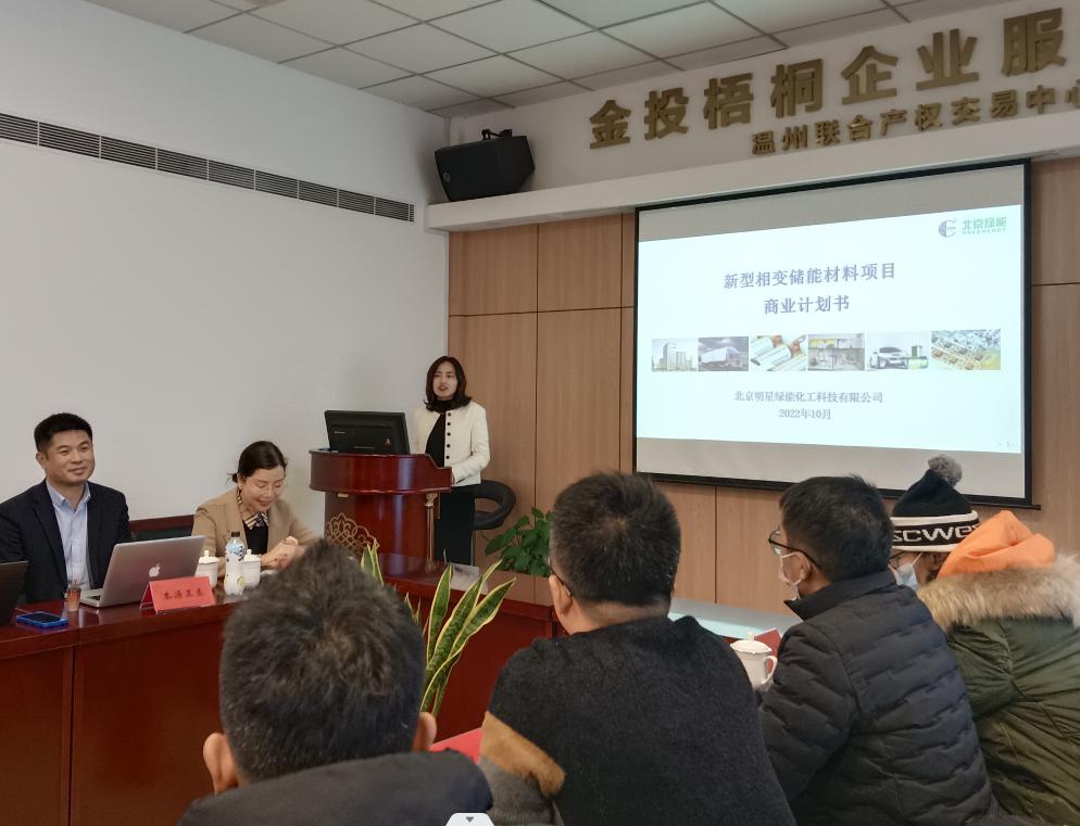 為積極響應(yīng)市委市政府招商引智工作部署,幫助招商項(xiàng)目對(duì)接當(dāng)?shù)赝顿Y機(jī)構(gòu),緩解項(xiàng)目融資難題,加快推薦項(xiàng)目落地溫州。1月16日,溫州聯(lián)合產(chǎn)權(quán)交易中心成功舉辦“2023金投梧桐企業(yè)服務(wù)沙龍暨‘機(jī)構(gòu)聚能 金融助企’——北京明星綠能招商項(xiàng)目專場(chǎng)路演”活動(dòng)。“溫資金融服務(wù)團(tuán)”及其它數(shù)十幾家投資機(jī)構(gòu)、產(chǎn)業(yè)園區(qū)等負(fù)責(zé)人踴躍參與。本源正泰(北京)投資有限責(zé)任公司和北京明星綠能化工科技有限公司就“新型相變儲(chǔ)能材料項(xiàng)目”進(jìn)行綜合路演。