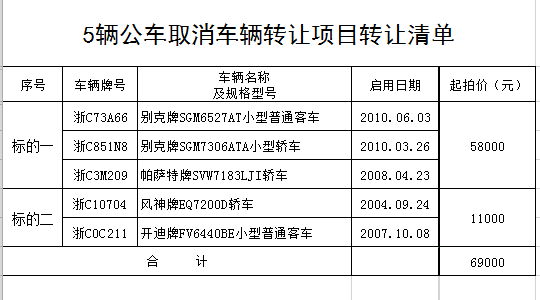 拍賣標的及起拍價:標的一溫州方圓計量校準有限公司3輛公務用車取消車輛,起拍價:58000元;標的二溫州水利電力勘測設(shè)計院2輛公務用車取消車輛,起拍價11000元。